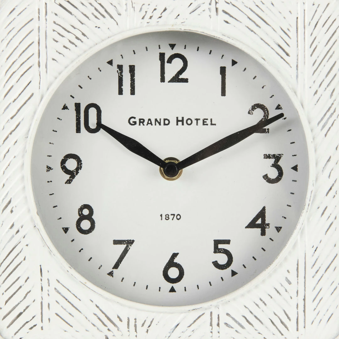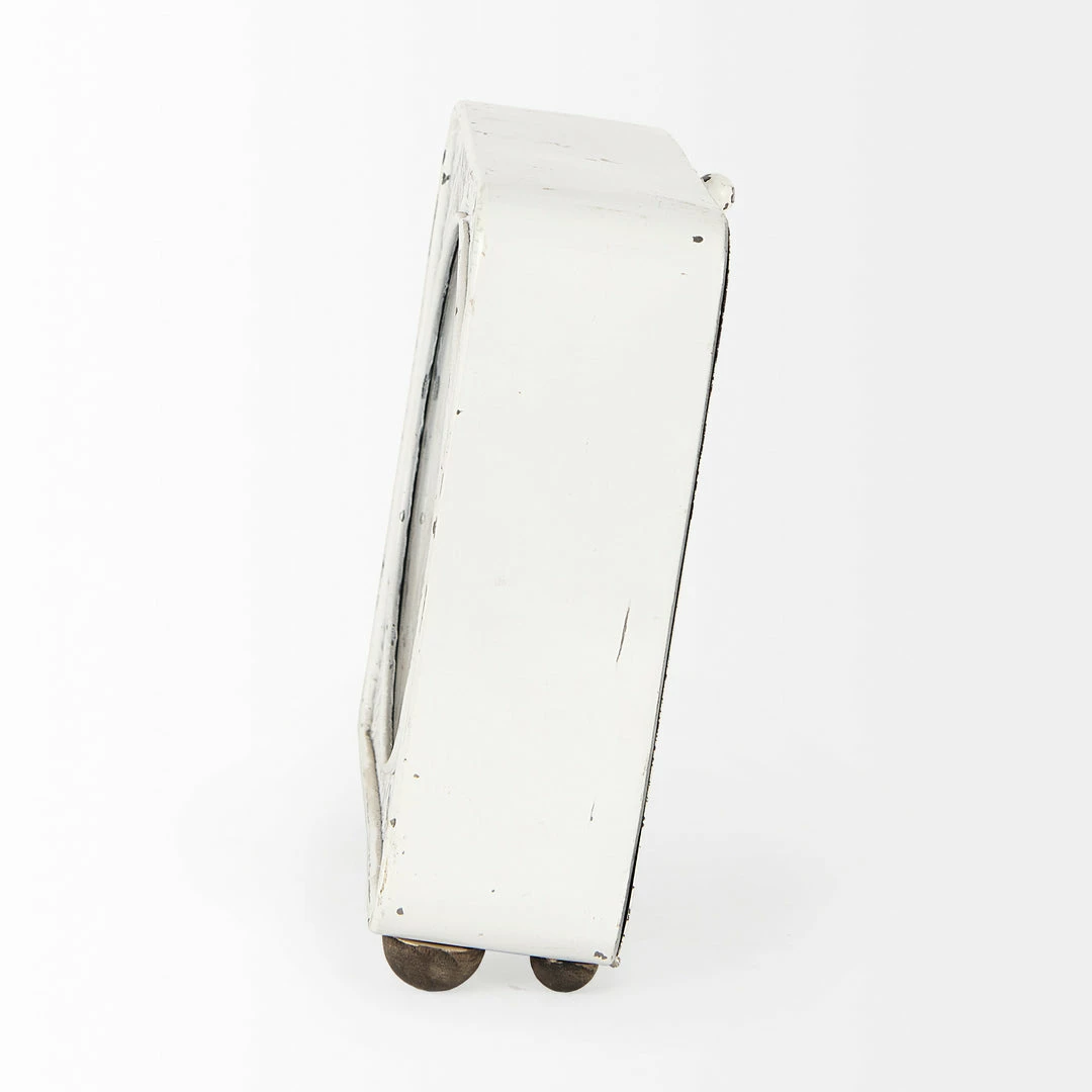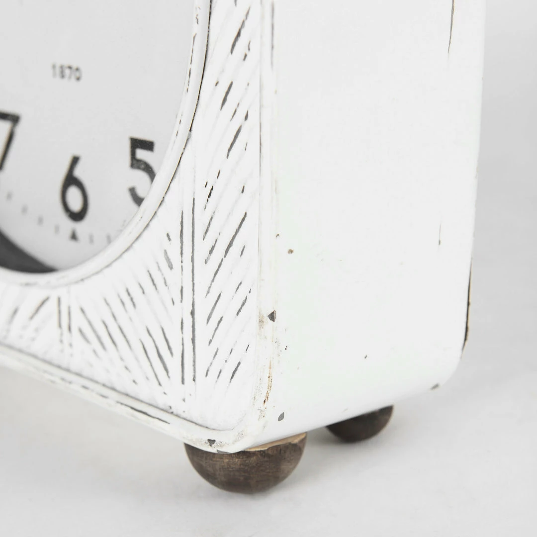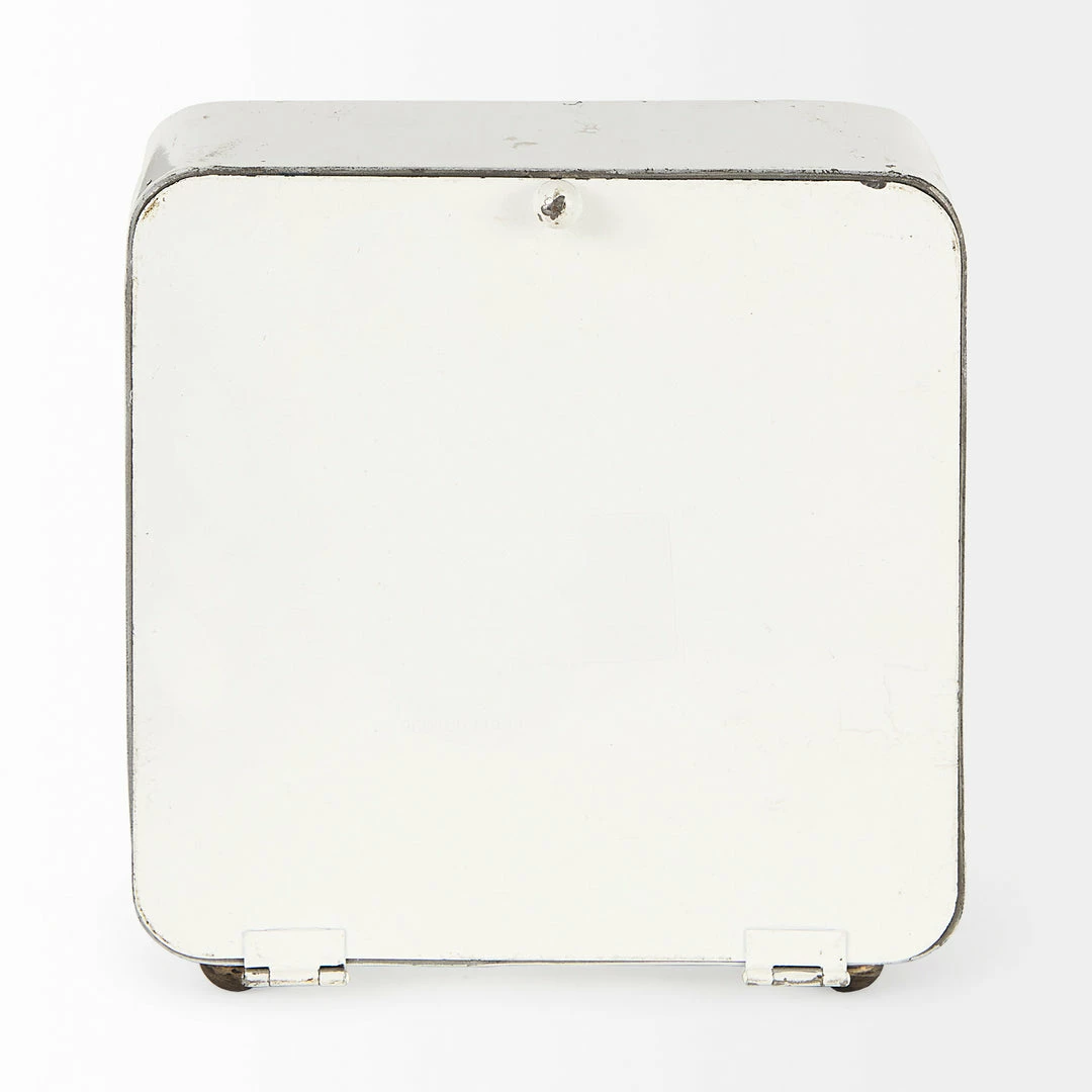 A stocky, little square clock (with rounded edges) which is made from solid iron that features a rustic white finish.