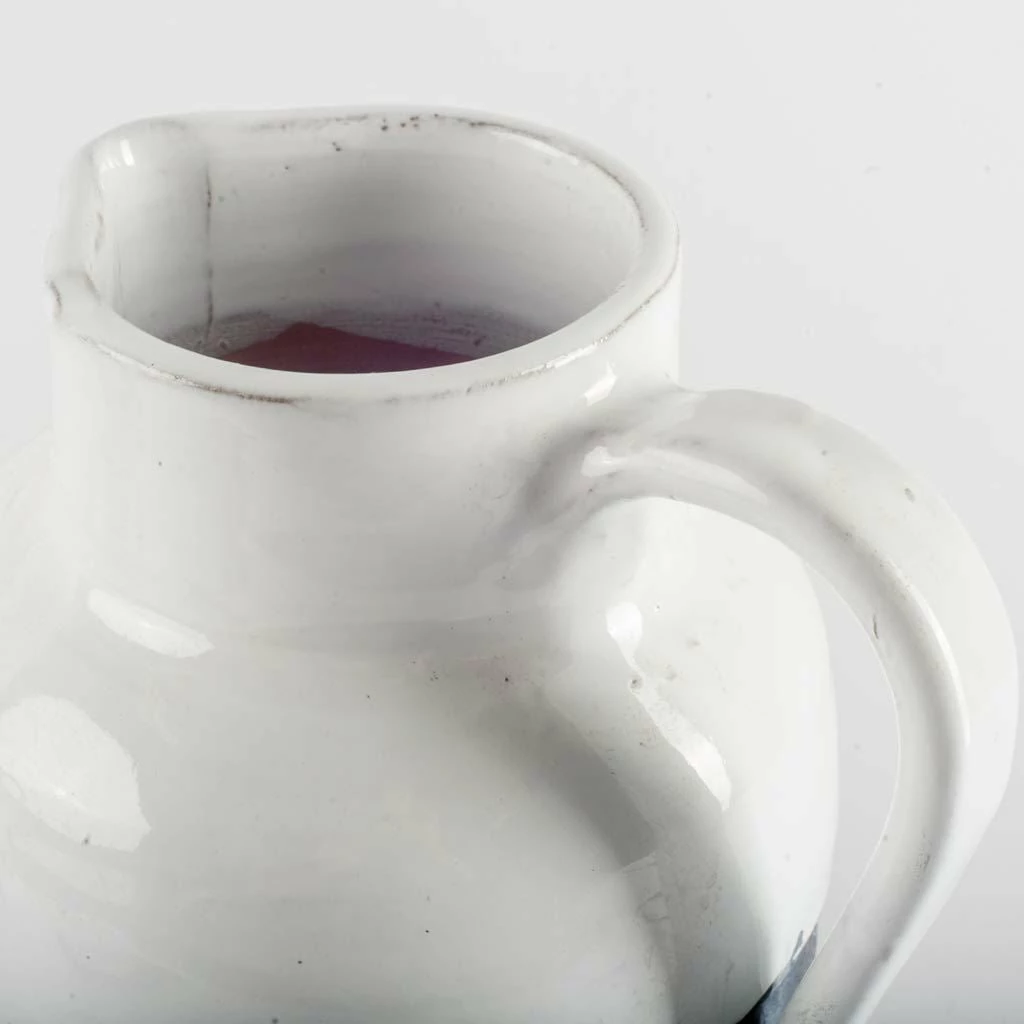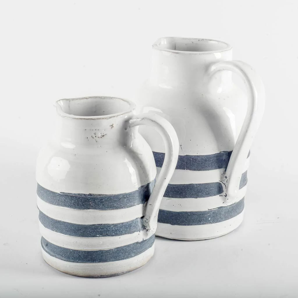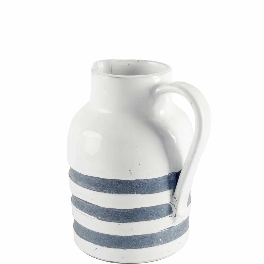 This vase is designed to look like a rustic weathered water pitcher with pouring handle and horizontal blue stripes.