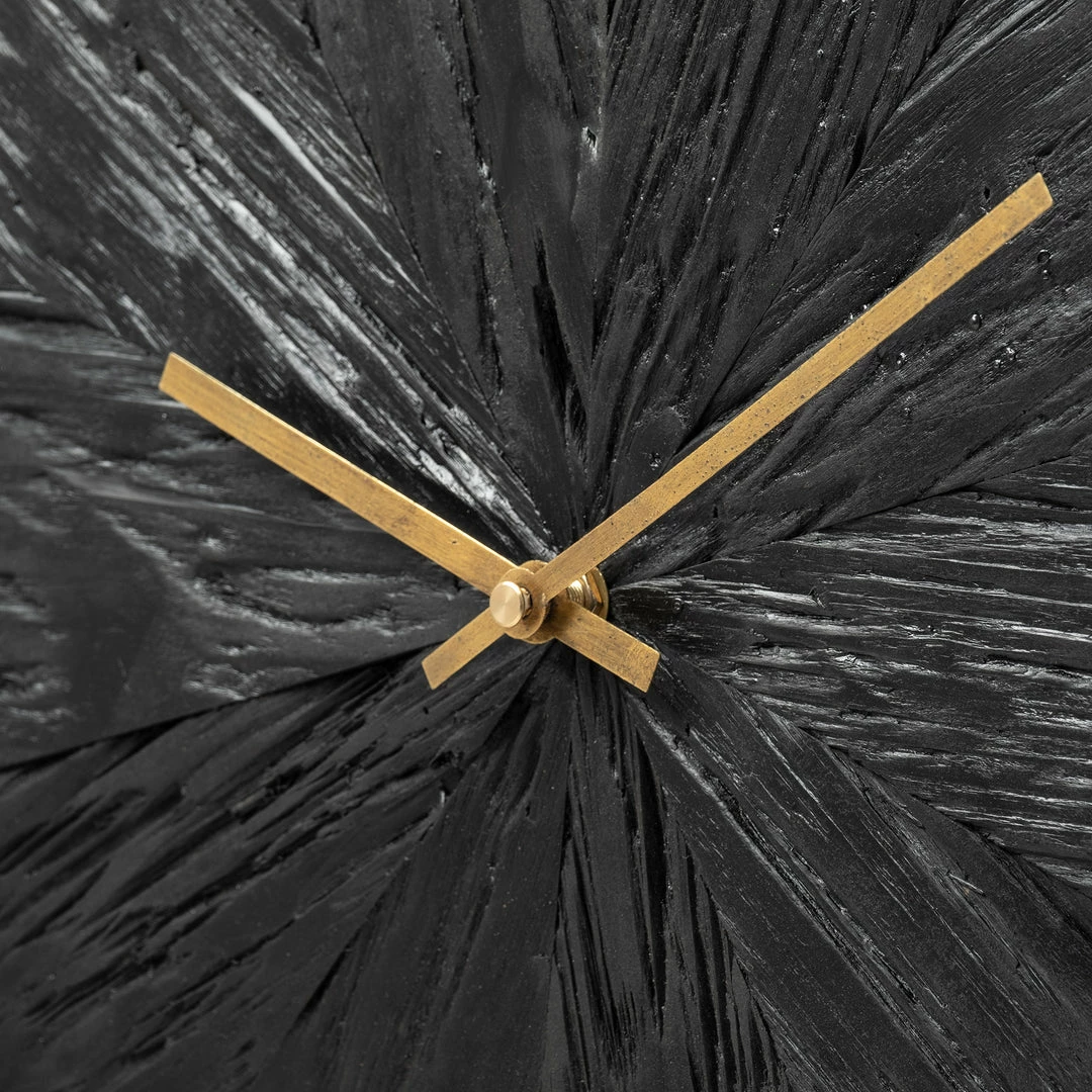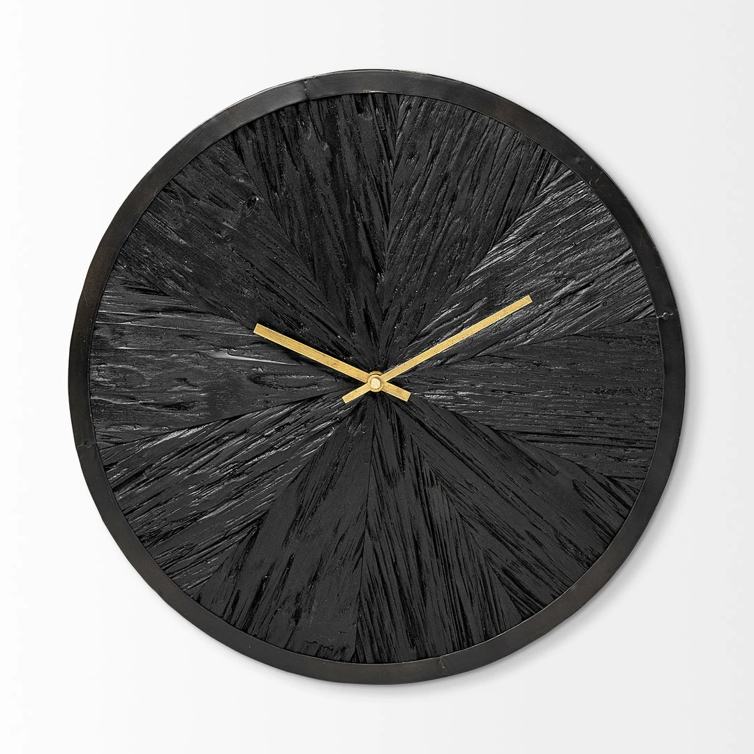 Measuring 16.5″ in diameter, the Sidney is a spectacular wall clock that is finished in a dark ebony tone with antiqued gold accents and looks great on any wall with a contrasting tone. It features a metal periphery that surrounds a wooden, unmarked face that flaunts an amazing texture. The dark-toned body of the Sidney wall clock is complemented by the radiant, antiqued-gold toned hands that not only add to the visuals of this clock but also make it easy to read time from a distance.