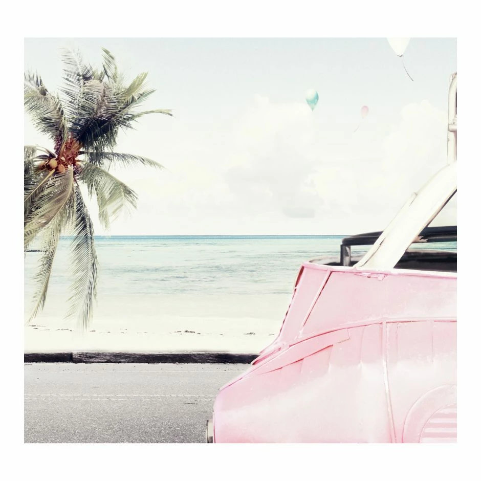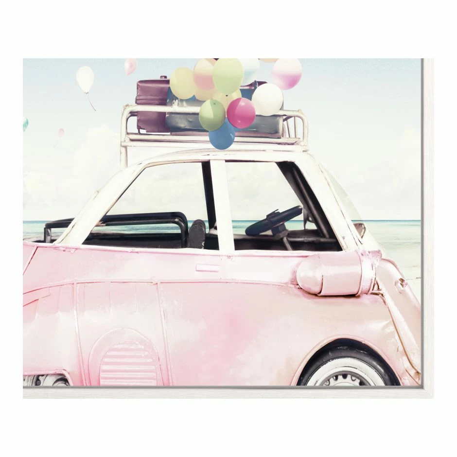 There’s a party, and of course, you’re invited. The Beach Party wall decor features a fantastic subject with blue skies, pastel-colored balloons, palm trees, and your very own bubblegum pink car. This multicolored beauty features ink printed on canvas for an artsy look.