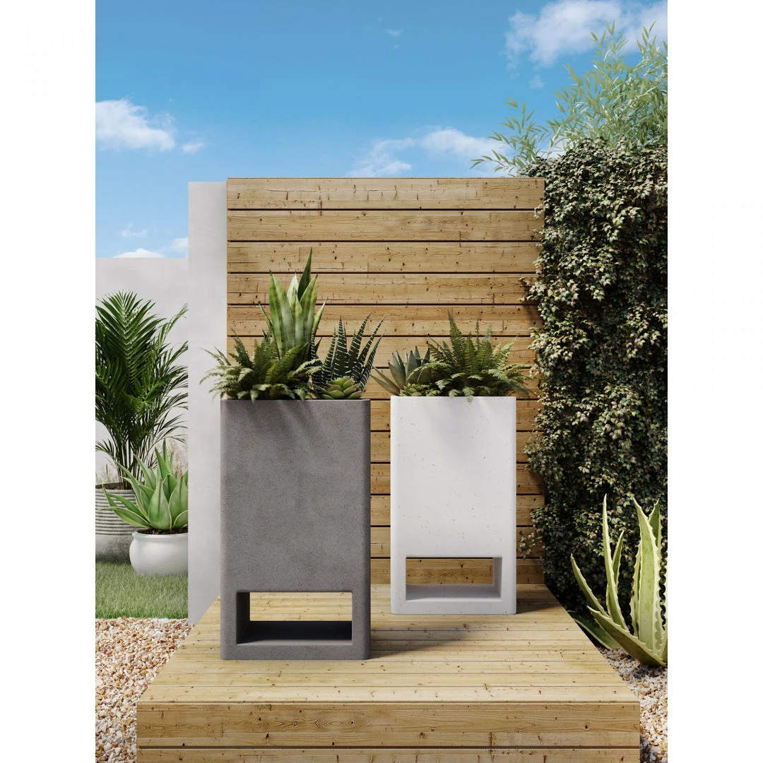 A sculptural planter to blend in seamlessly with your outdoor setting. An eye-catching base cutout and tall rectangular form are fused in greyscale concrete that adds a sense of intrigue to this outdoor statement design. Use as a standalone or in pairs for a contemporary, symmetrical display in two soothing colors in a matte finish.