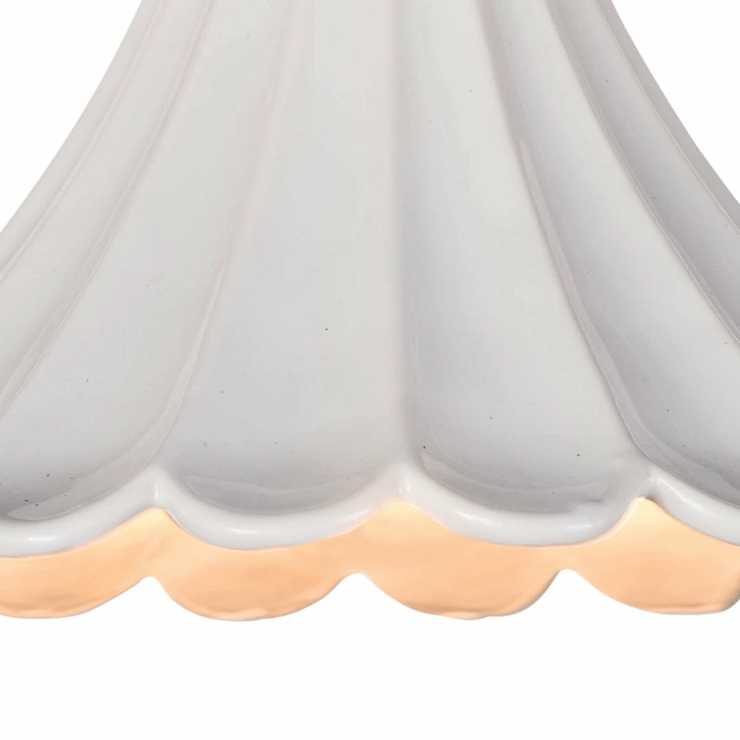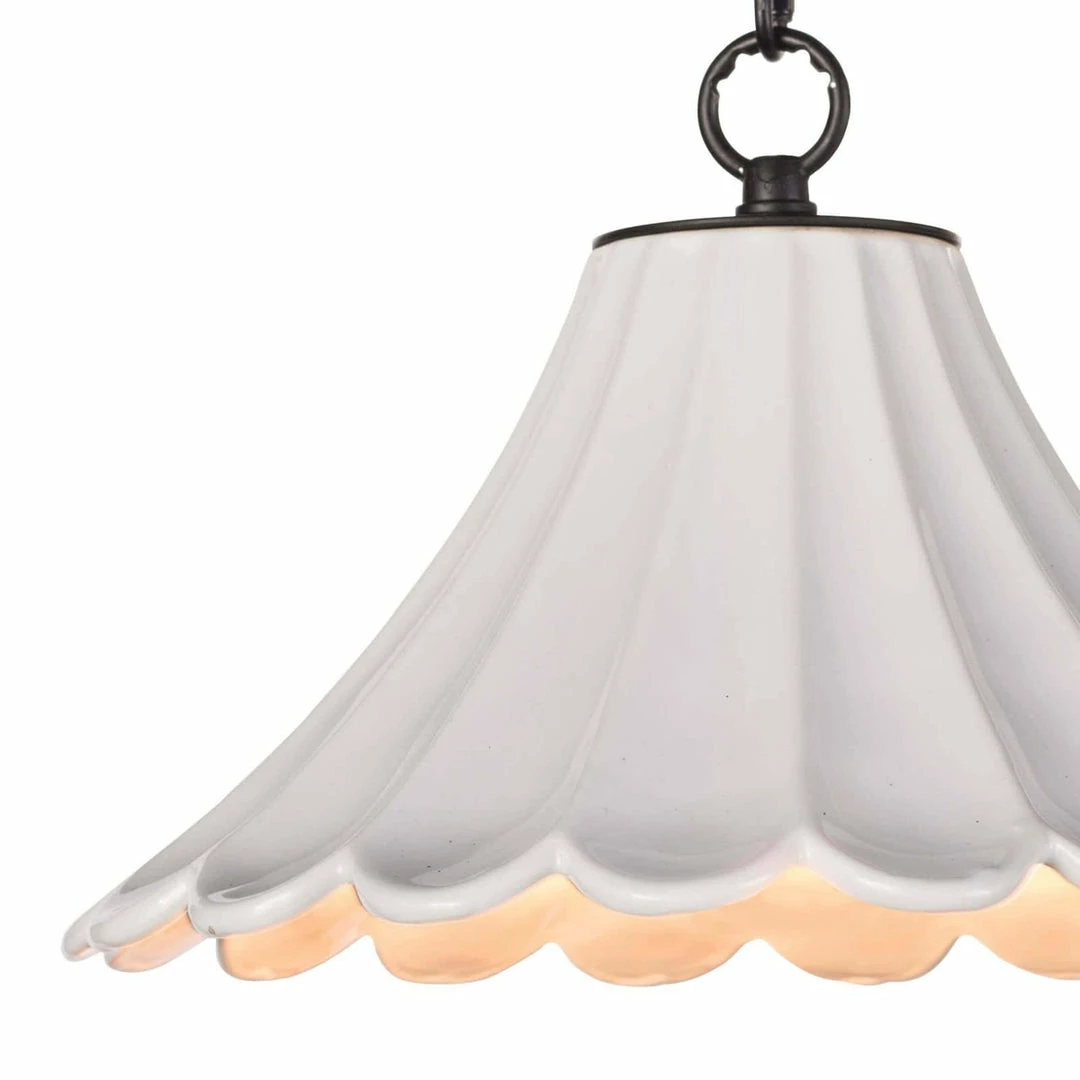 In full bloom: Cally’s fluted white ceramic shade is contrasted by a black chain, which makes for a farmhouse statement in a kitchen or bath.