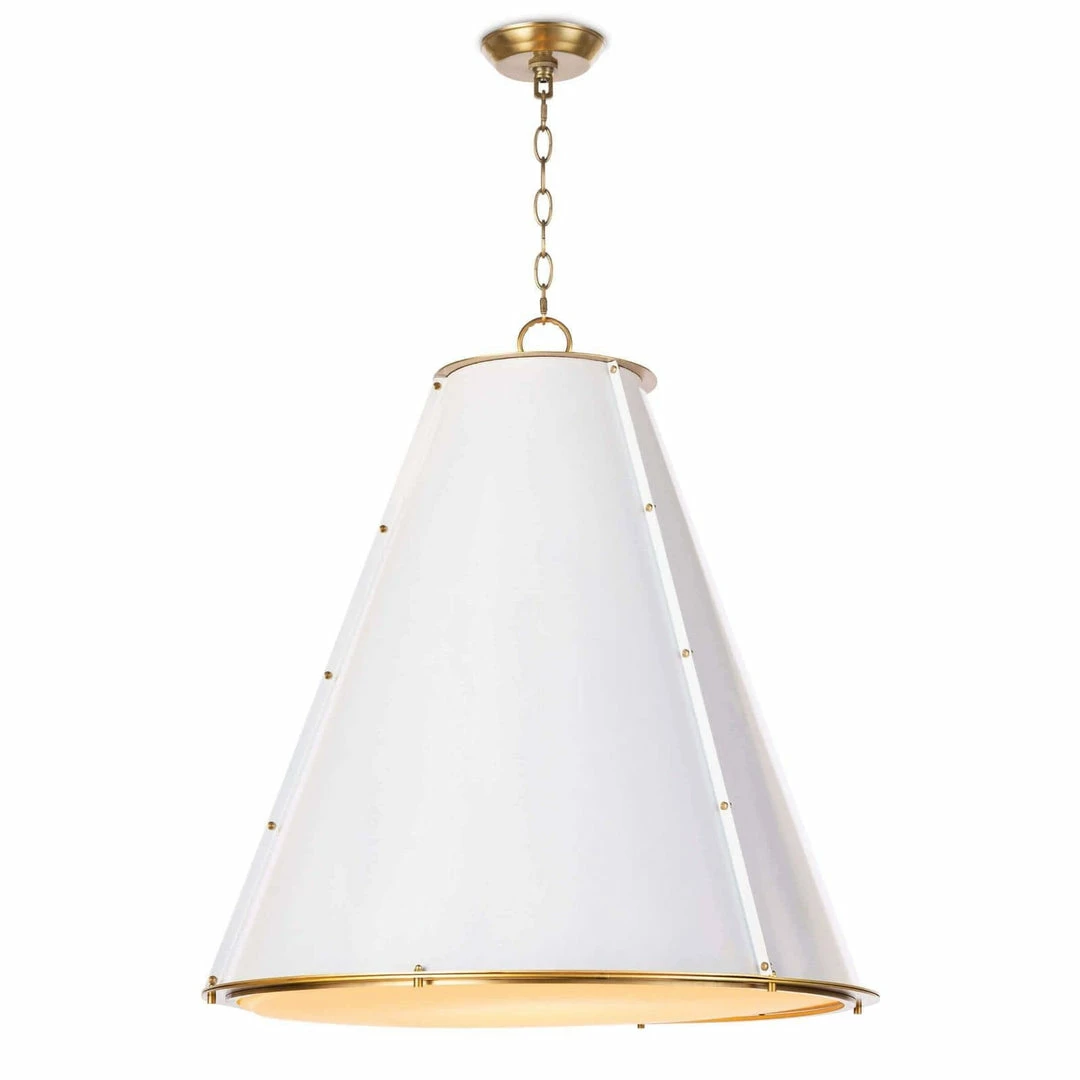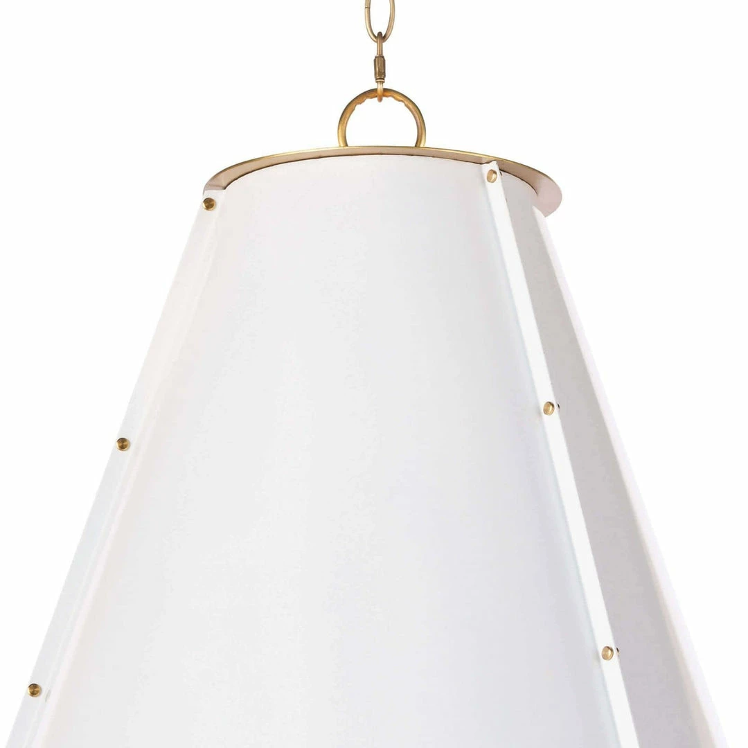 A cone silhouette is trimmed with a natural brass ring on the top and bottom of the French Maid chandelier. Brass studs provide an industrial detail and a diffuser shade provides nice ambient light for a kitchen island.