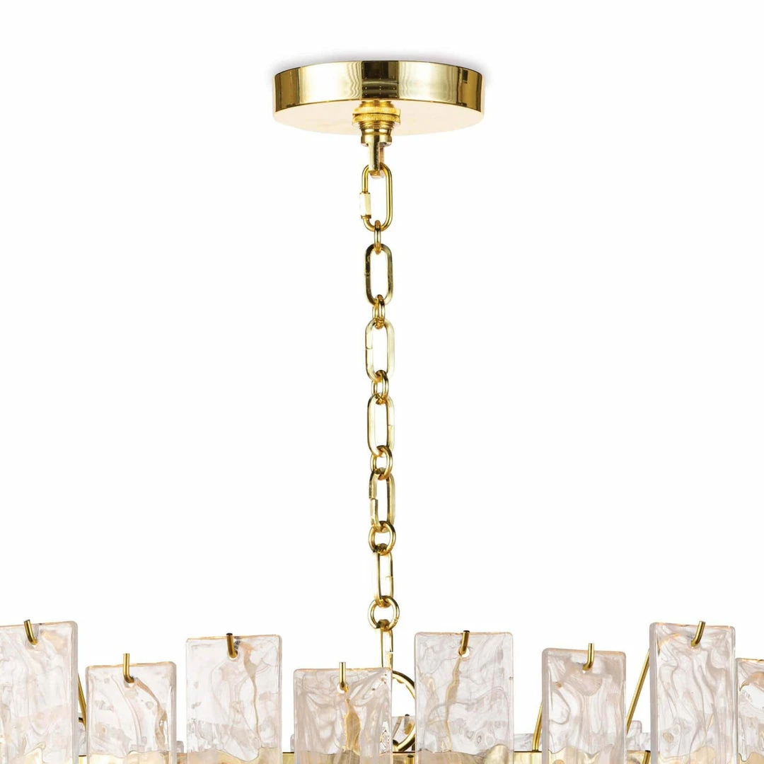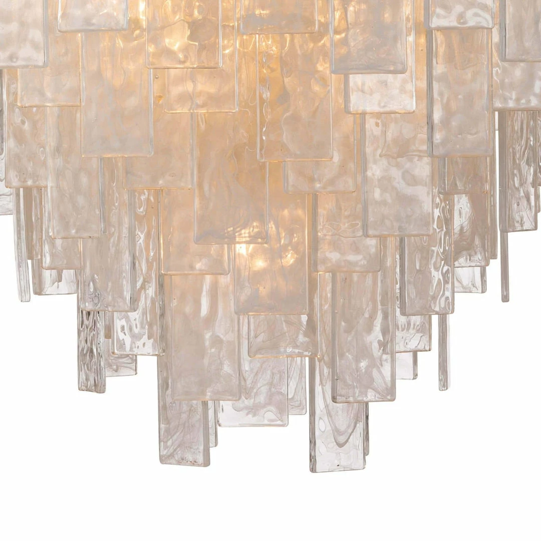 Panes of striking water glass adorn the large Glacier chandelier to create a dynamic piece full of movement. The glass diffuses the light, providing a soft glow to the area around it, perfect for a foyer or living room.
