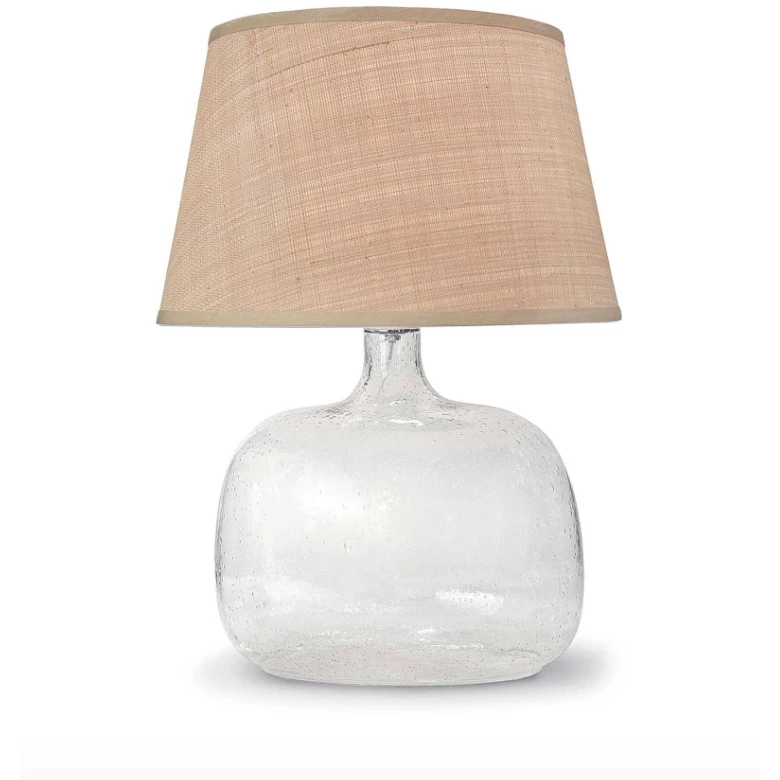 Adding a level of sophistication to any space, this table lamp is crafted of gorgeous seeded glass and topped with a natural rattan tapered shade.