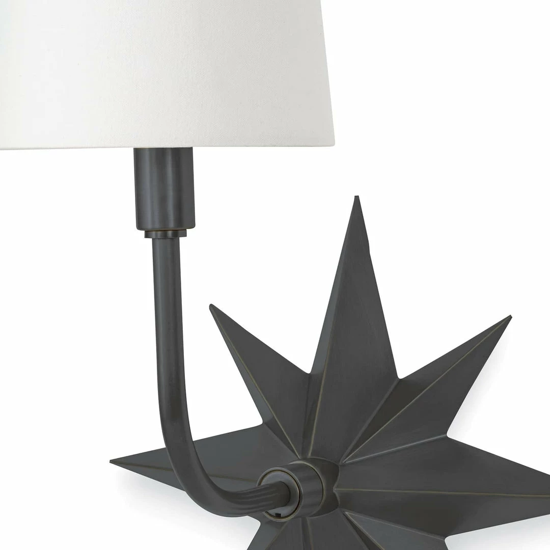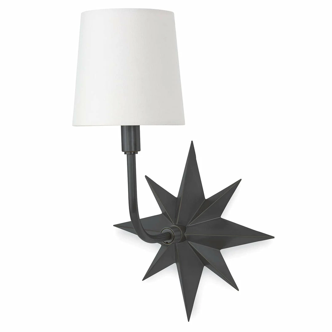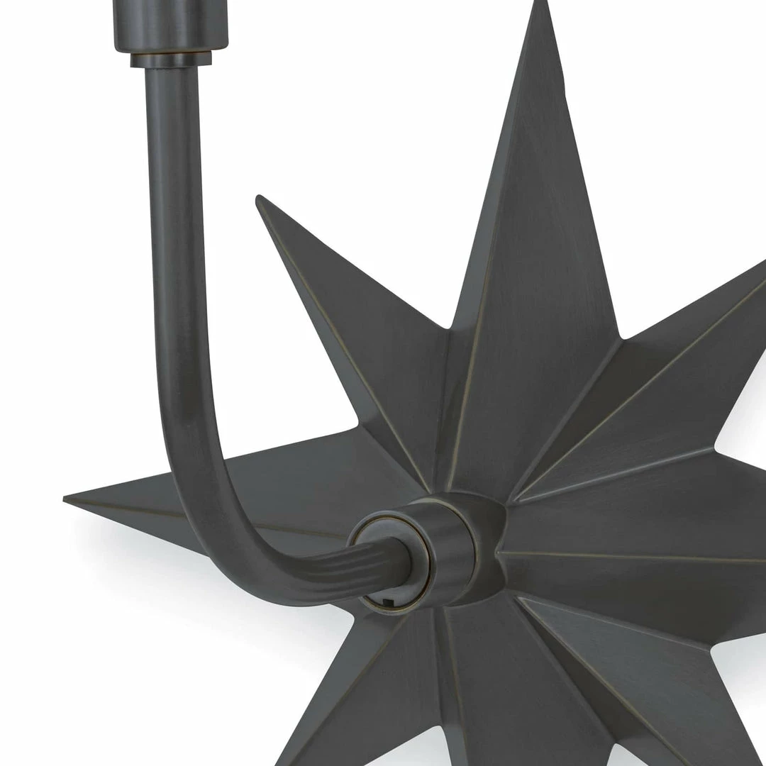 The Etoile Sconce exudes a classic coastal aesthetic with its attractive nautical star motif. Each raised edge of the star backplate has been expertly honed for maximum dimension. Topped with a classic, crisp natural linen tapered shade, place the Etoile in a living room, bedroom, kitchen, above a console or on either side of a cased opening for a bit of time-honored nautical design.