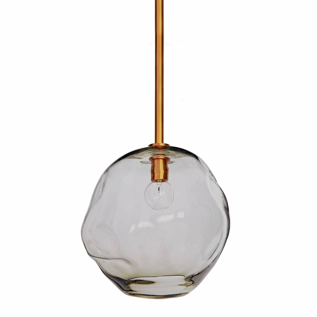 Molten glass has an inherent beauty because of it’s artisan crafted, organic form. The natural, smoked glass shade variation creates dramatic light play and contrast, especially when combined with the modern appeal of its natural brass pipe, canopy and components. Use as one pendant above a kitchen or bathroom sink, or in multiples above a dining room table, kitchen island or bedside lighting. This simple, sculptural lighting fixture is sure to add style and drama to your space.
