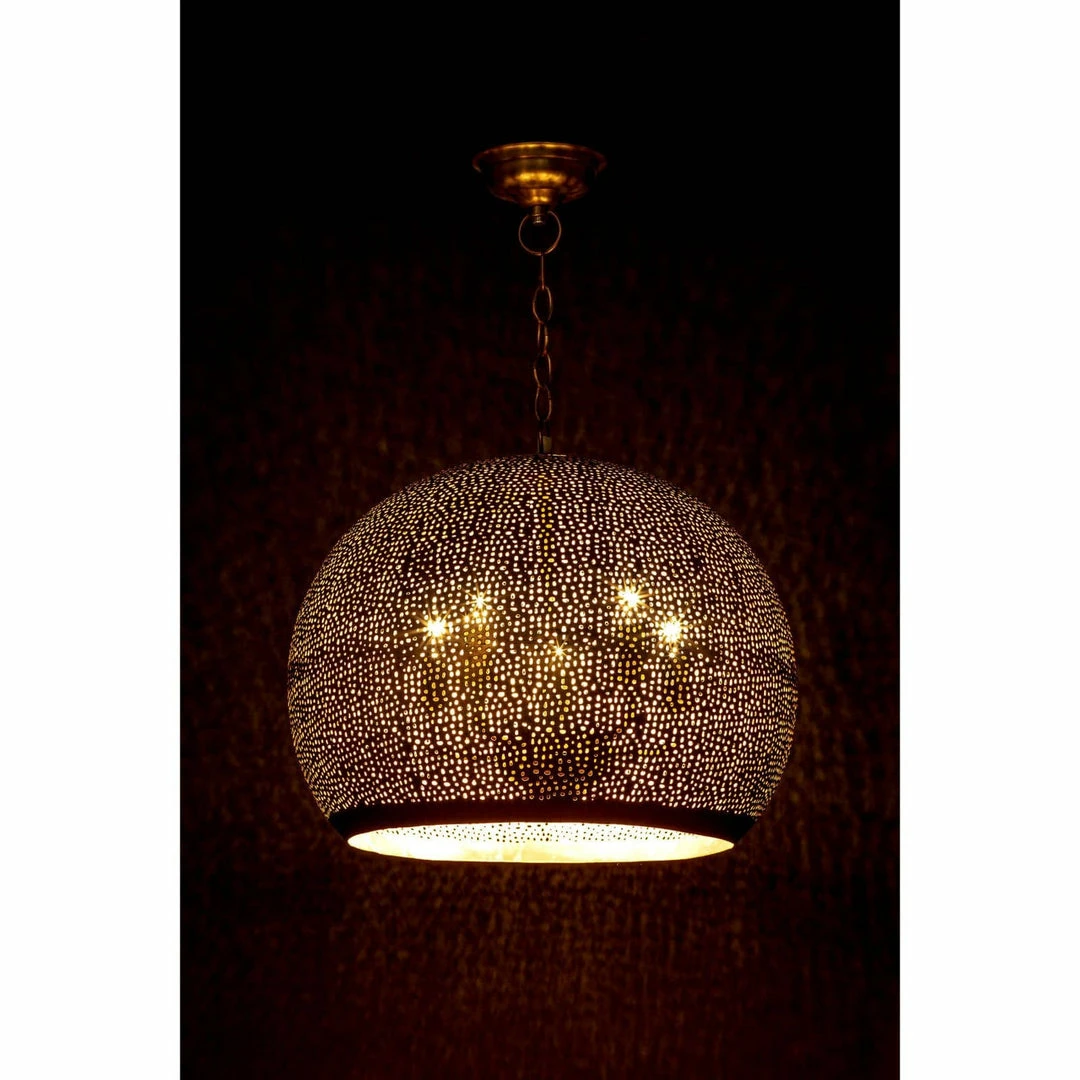 Handcrafted with a brilliant natural brass finish and an organic perforated design this pierced metal sphere pendant is designed to showcase the warmth and illumination of incandescent light.
