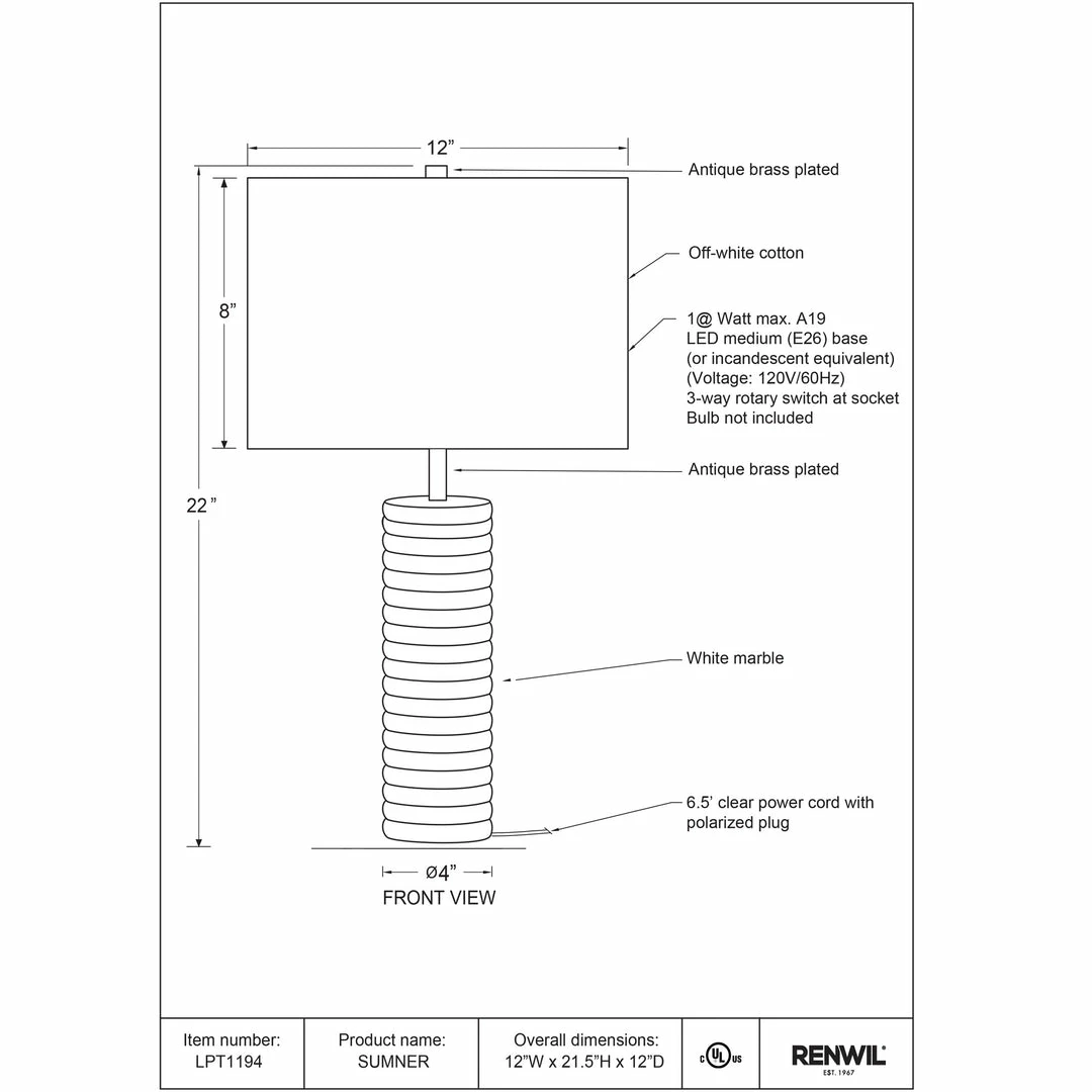 - White Marble / Iron / Antique Brushed Brass Plated Finish / Off-White Cotton Shade