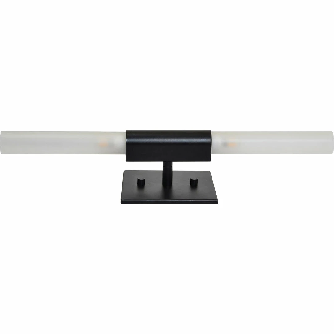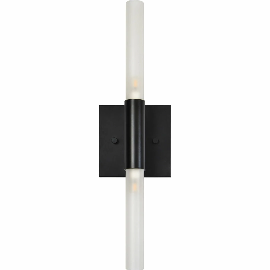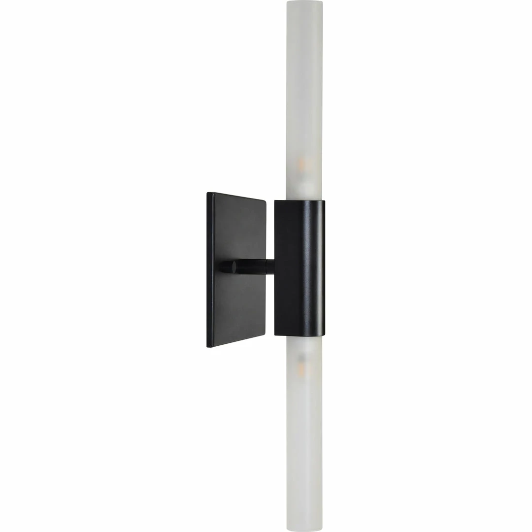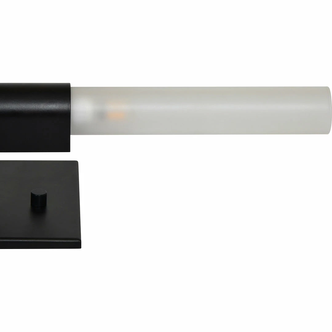 A narrow space in the home is filled with style and light with this sconce. The matte black painted iron structure lends itself well to the industrial interior, as the smooth angles feel fitting within a contemporary design as well. The etched white tubular glass has a soft quality when unlit and displays a warm glow when lit.