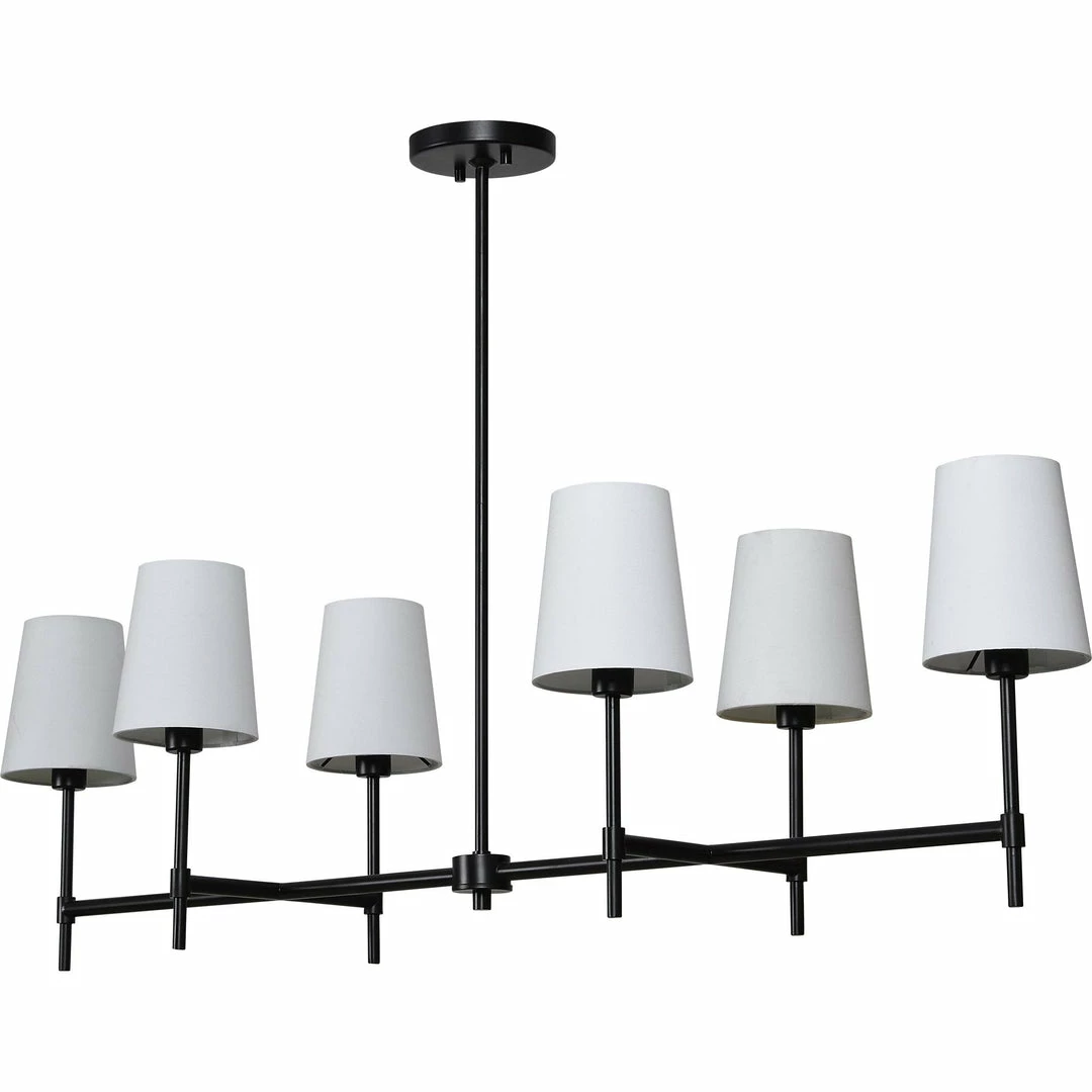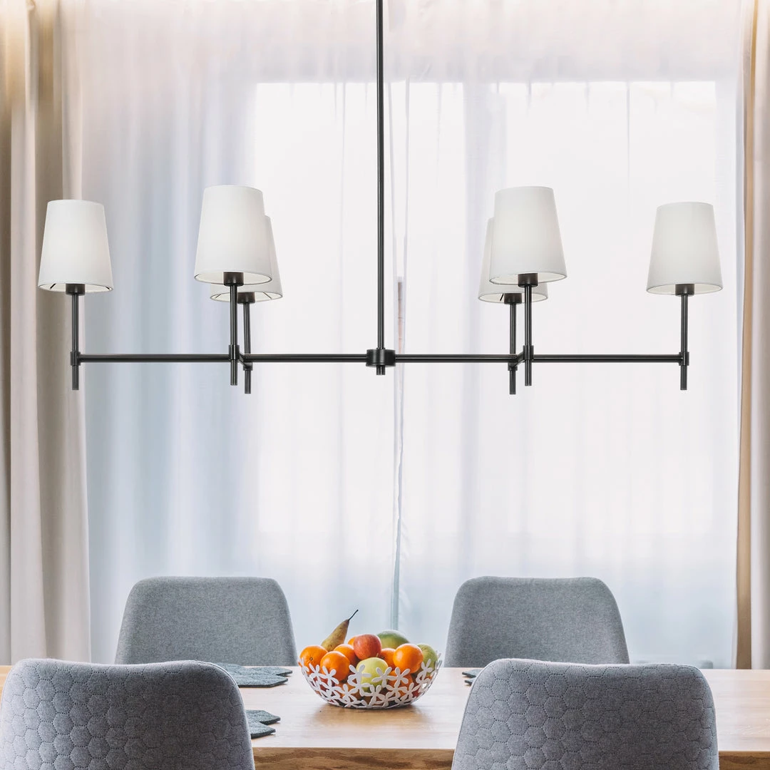 A traditional ceiling fixture design with a twist. This piece allows the dining or living space to feel classic cosmopolitan. The contrast of the matte black powder-coated iron build and light lamp shades is always pleasing to the eye whether lit or dimmed.