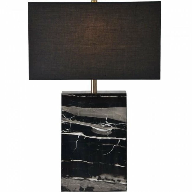 Marble Table Lamp with black and white marble finish and black linen shade.
