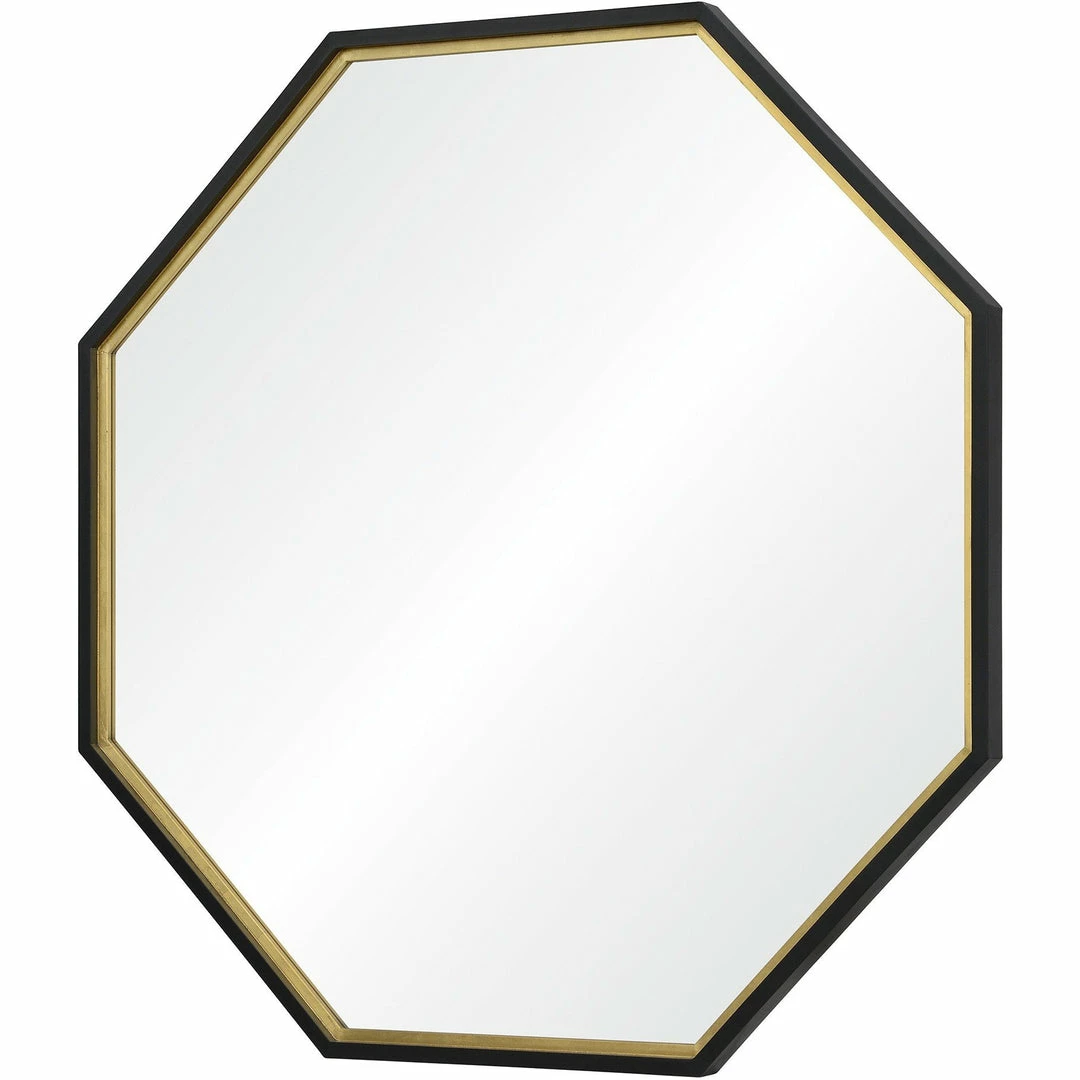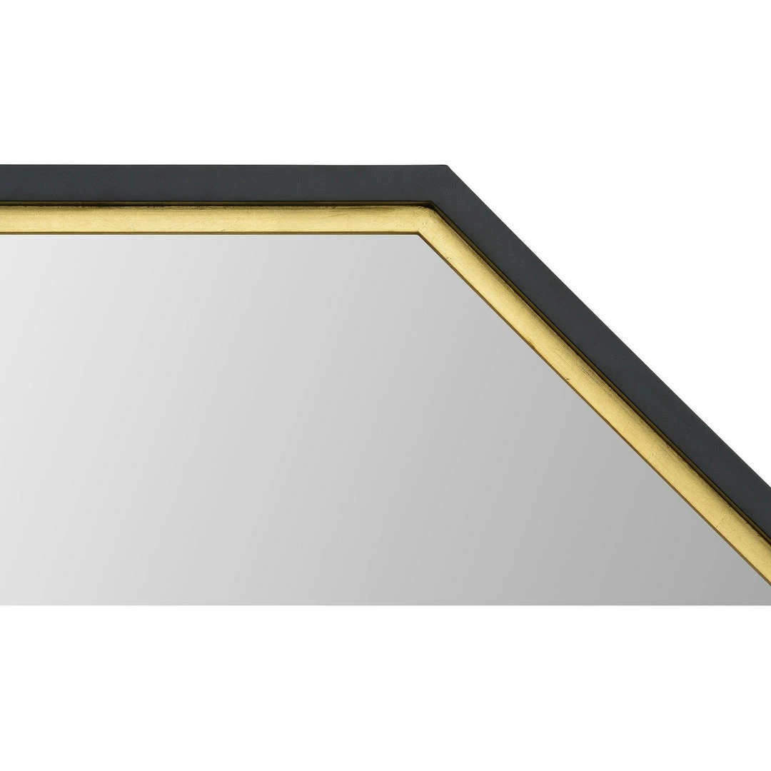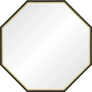 The Octo mirror has a pine frame that is painted black with a gold leaf finish.