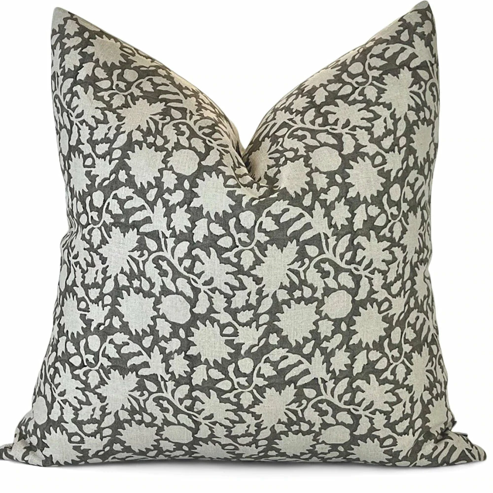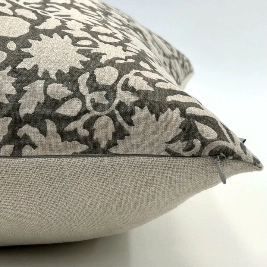 It features a delicate floral pattern hand-block printed using traditional printing techniques. The colour and texture of this soft linen work well with all of our other hand-blocked patterns. As well, it pairs beautifully with our soft velvets.