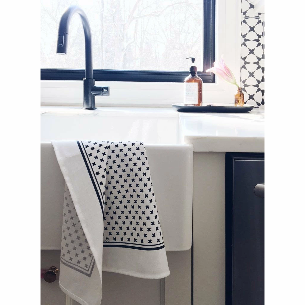 These towels are screen printed in Sweden with vegetable based dyes and are designed in Toronto, Canada. The towels are a mid-weight 50/50 cotton-linen blend. This blend allows the towel to soften over time naturally while maintaining durability and absorbency. With a convenient hook sewn into the top and a generous size, this isn’t just a pretty kitchen accessory- it will work hard too!
