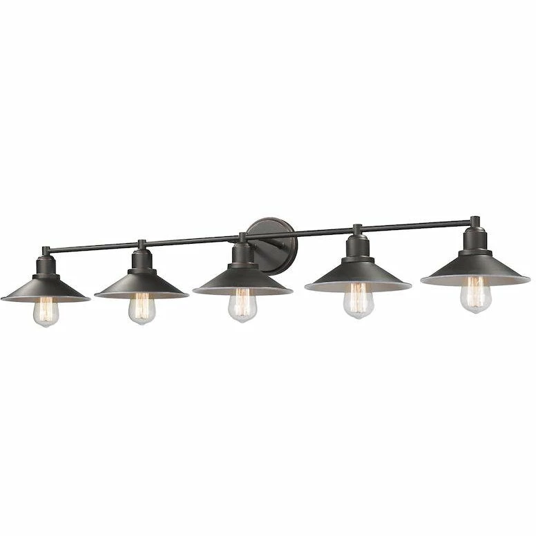 This elegant five-light vanity fixture positions itself as a marquee design element in a master en suite. Enjoy the antiqued effect with modern appeal, and find versatile beauty in a brushed nickel finish steel frame and hood shades.