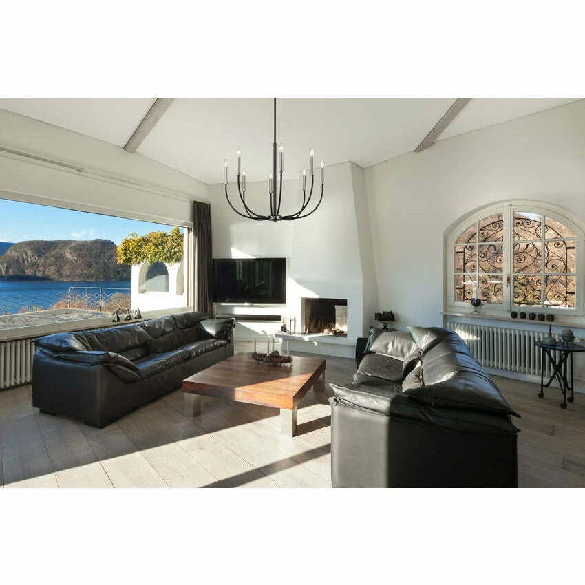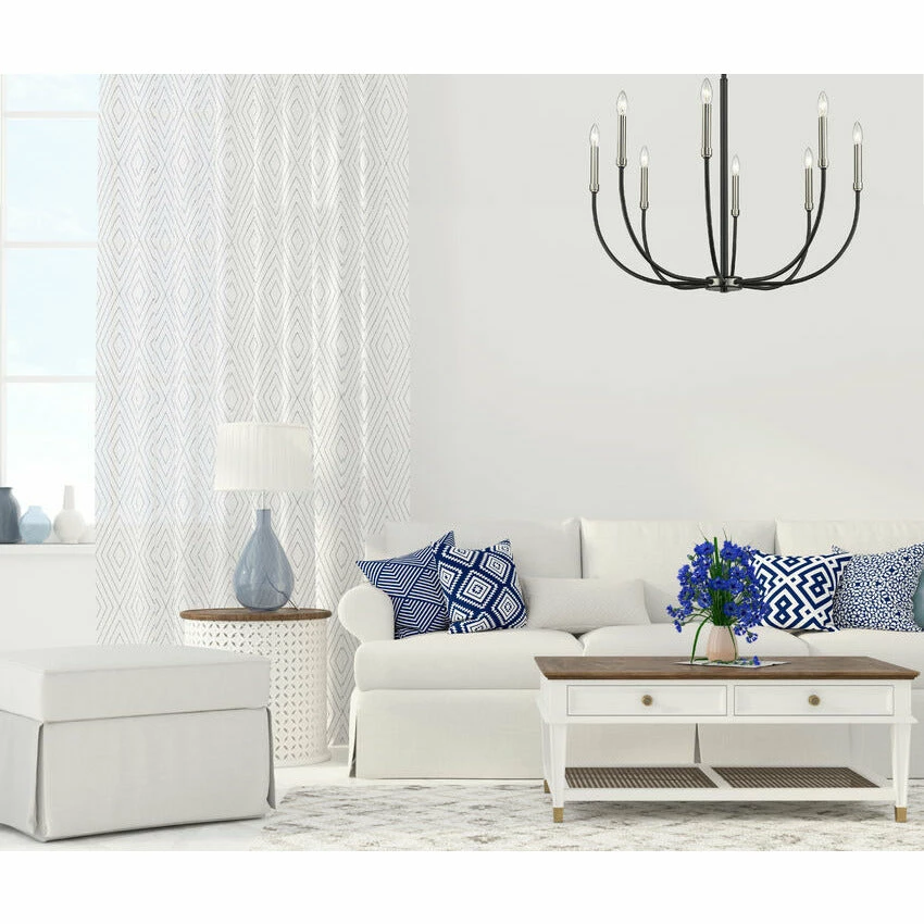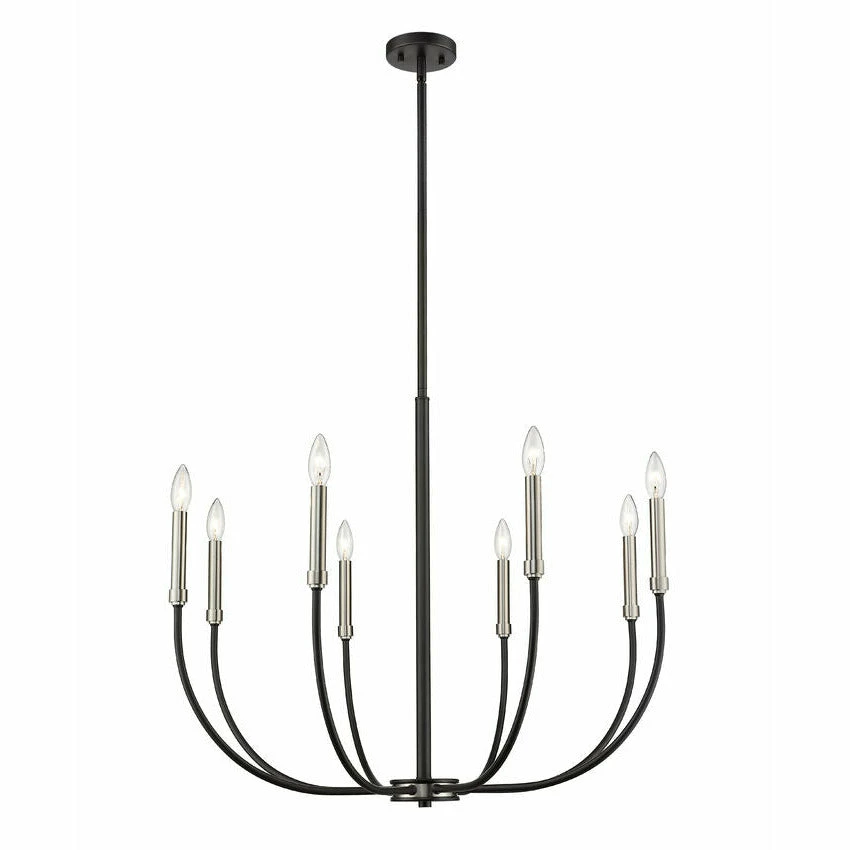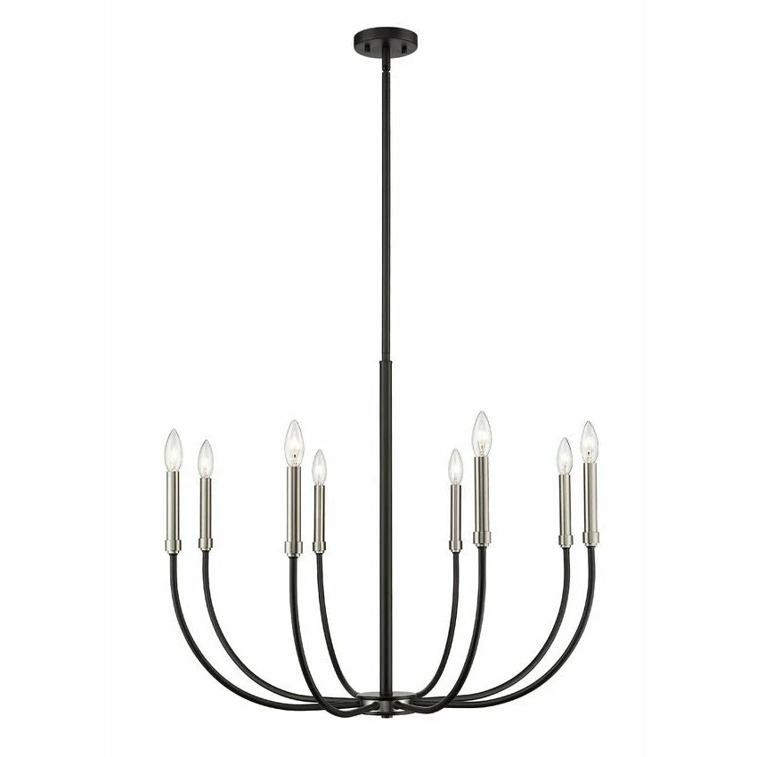 Shapely contours highlight the appeal of this two-tone eight-light chandelier. The candelabra-type design features a classic matte black and brushed nickel finish for an elegant touch. This alluring chandelier will add a discernible charm to any dining room, foyer, kitchen, or entertainment room.