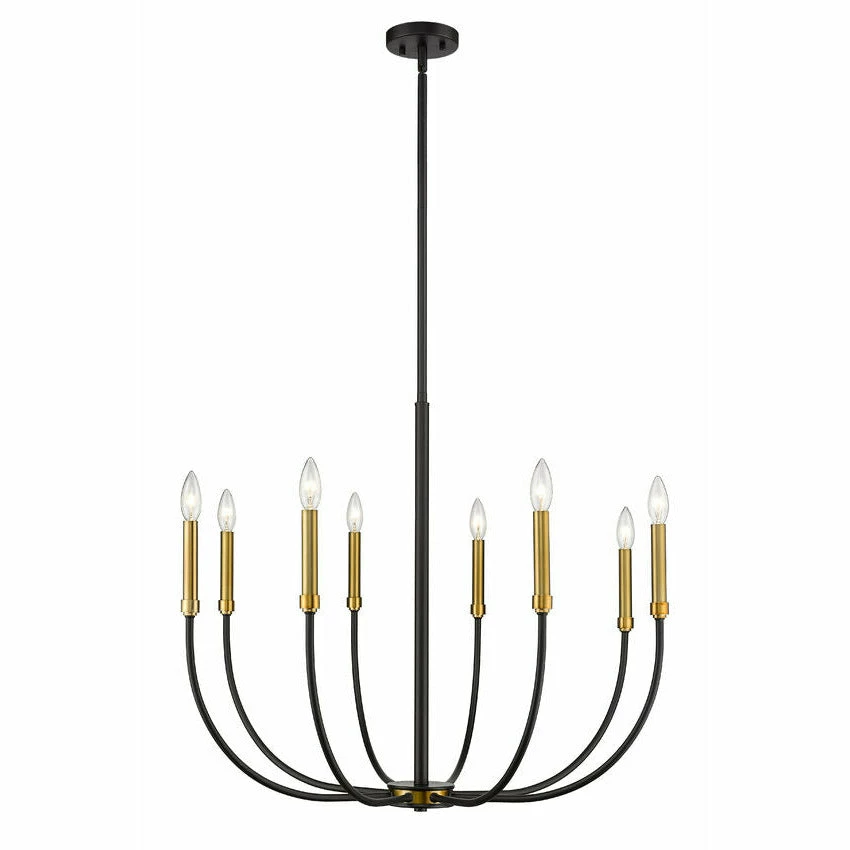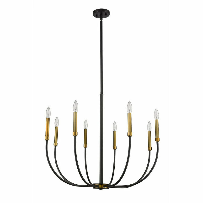 Shapely contours highlight the appeal of this two-tone eight-light chandelier. The candelabra-type design features a rich matte black and olde brass finish for a warm elegant touch. This alluring chandelier will add a discernible charm to any dining room, foyer, kitchen, or entertainment room.