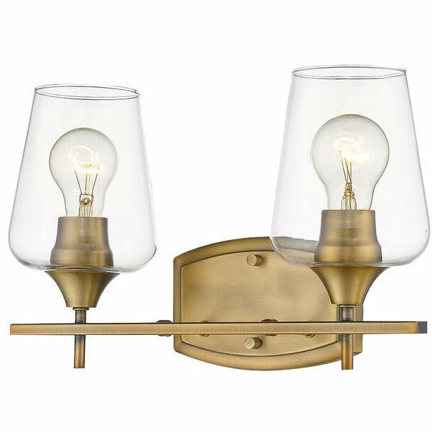 Upscale sophistication with a Mid Century Modern vibe tells the story of this elegant two-light vanity light. A blend of delightful materials offers stunning large glass shades with Olde Brass finish metal, delivering a rich, warm palette that embellishes the look of any transitional bath space.