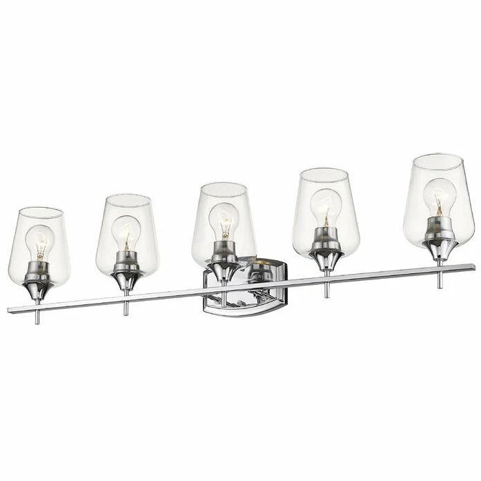 Upscale sophistication with a Mid Century Modern vibe tells the story of this elegant five-light vanity light. A blend of delightful materials offers stunning large glass shades with radiant Chrome finish metal, Highlighting a custom master bath vanity with a noticeable sheen.