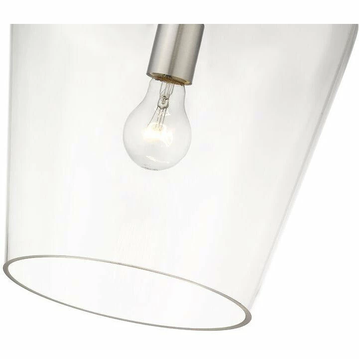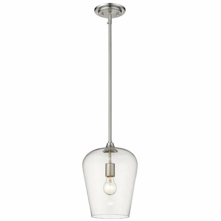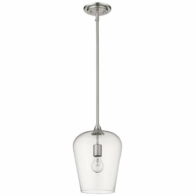 Designed with modern elegance in mind, this brushed nickel pendant is a stunning home decor upgrade. A single light beneath a clear glass shade is suspended from a sleek metal frame to create a magnificent display of light.