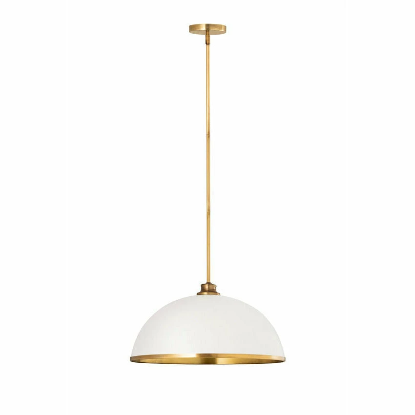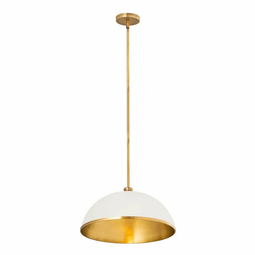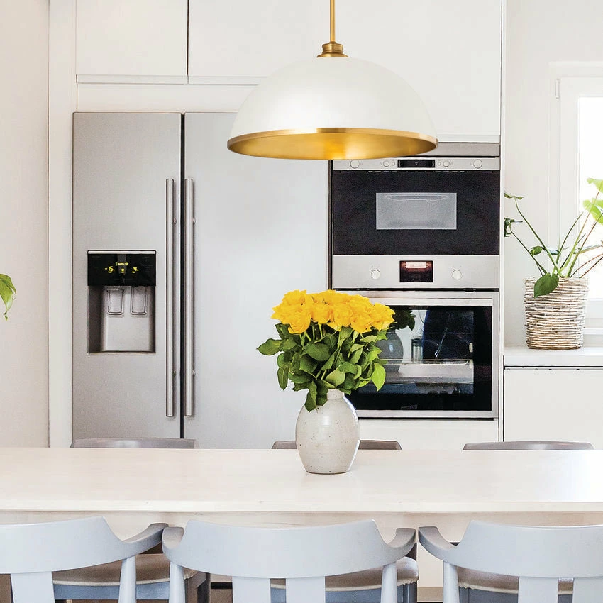 Sleek style takes on a modern look in this domed one-light pendant, a perfectly versatile way to illuminate a contemporary dining room, kitchen, or main living area. This pendant reflects myriad motifs including farmhouse, urban, and industrial, and brings simplicity with tasteful aesthetics. Crafted of matte white finish stainless steel, its accenting rubbed brass finish edge trim, down rod, and canopy deliver a decadent look.