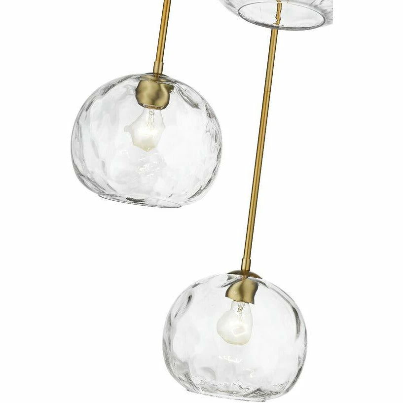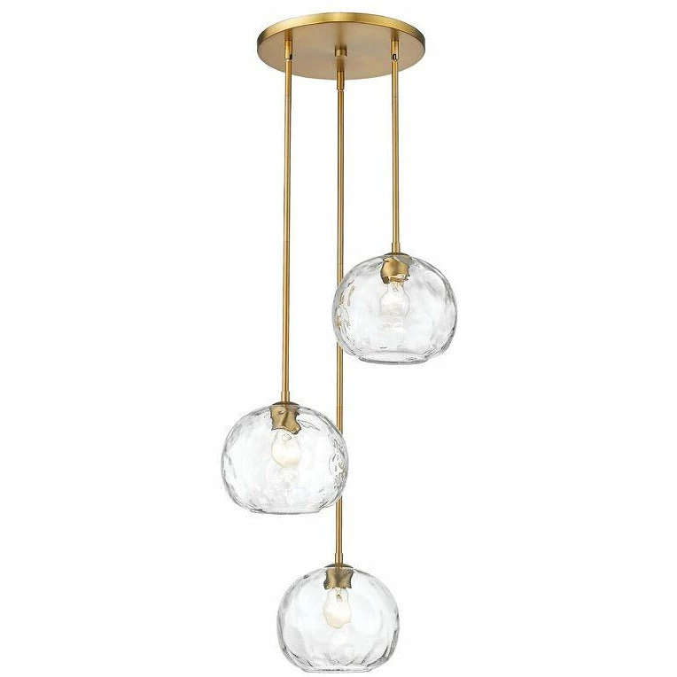 Define your modern space with the eye-catching, streamlined presence of this contemporary three-light pendant. Grooved, rounded shades are made from clear, water-textured glass, suspended from a sleek steel frame with a brushed nickel finish. Your contemporary dining room or family space gets an instant boost with this sophisticated fixture.