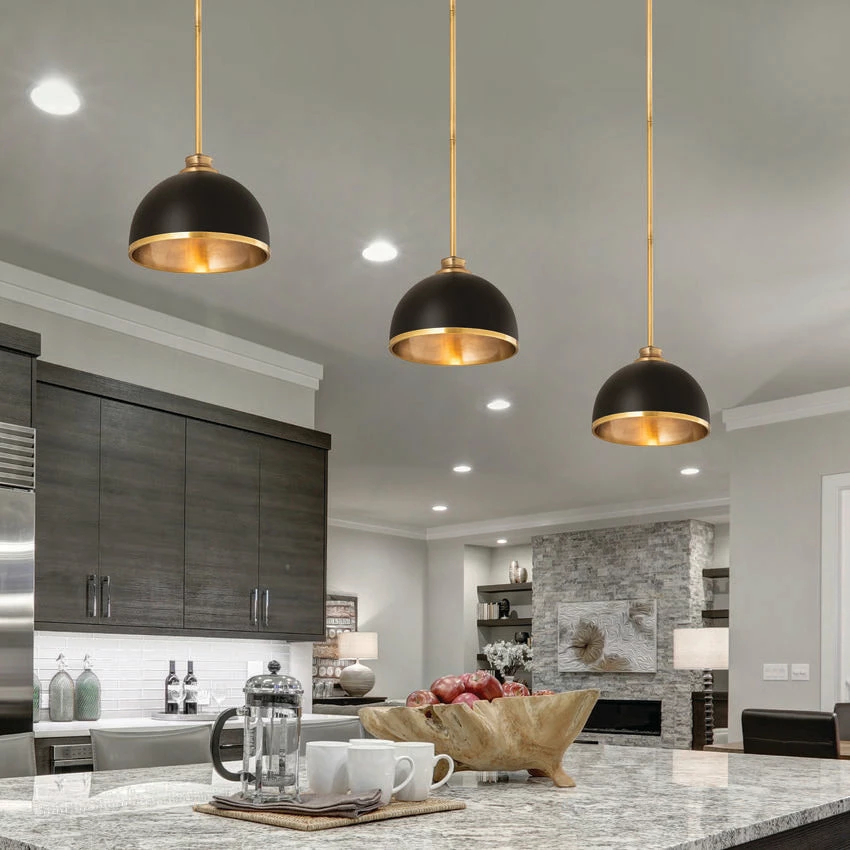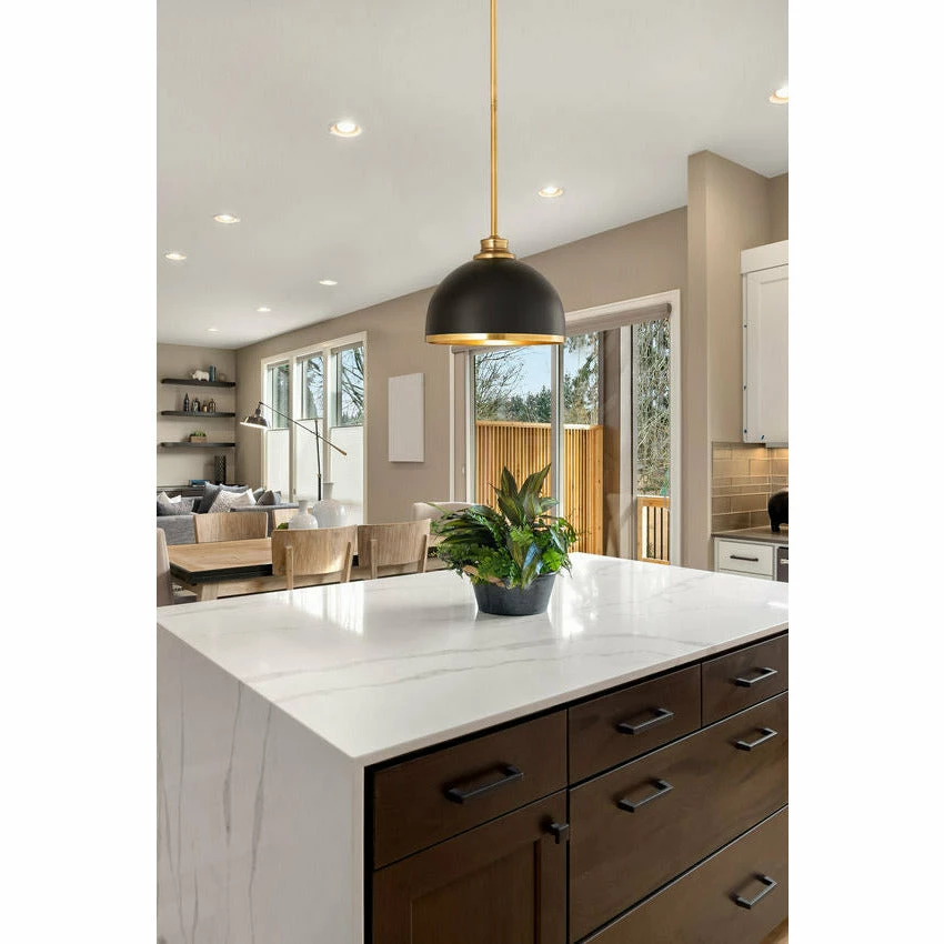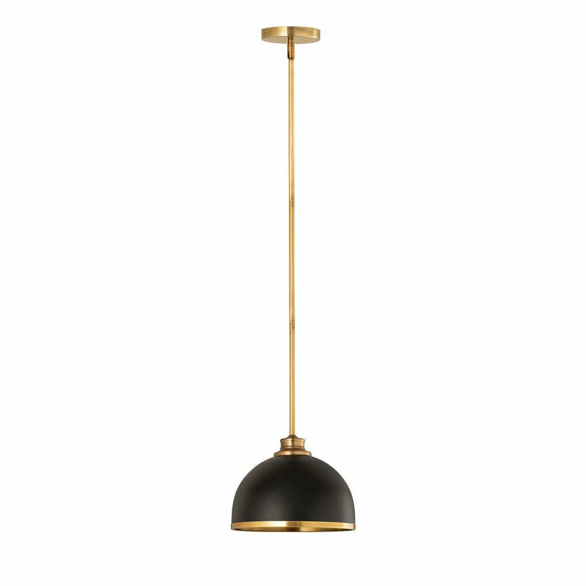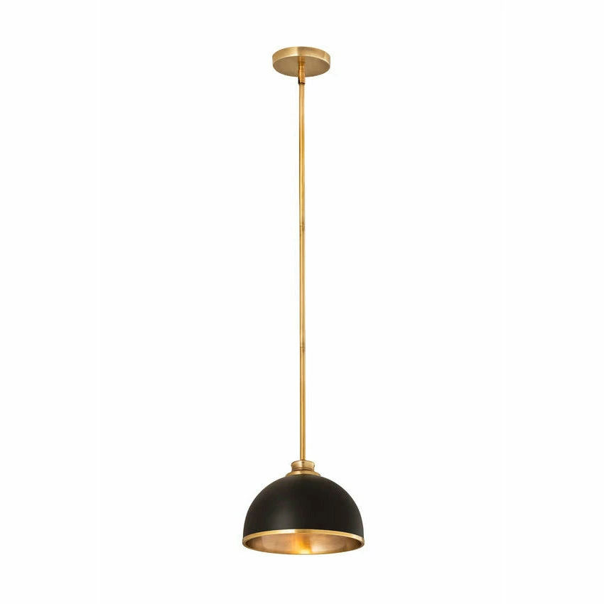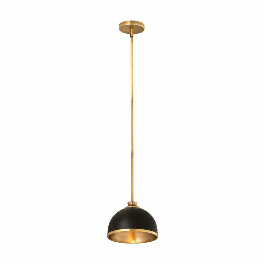 Easy elegance follows this domed metal one-light pendant with a crisp industrial influence and minimalist silhouette. A domed shade fashioned of matte black finish stainless steel is trimmed in warm rubbed brass finish metal with a rubbed brass finish down rod and canopy. This contemporary pendant is adaptable to a variety of décor schemes including farmhouse, modern industrial, and urban modern.