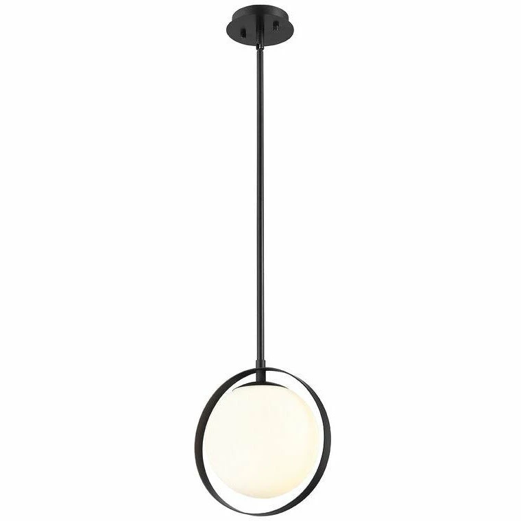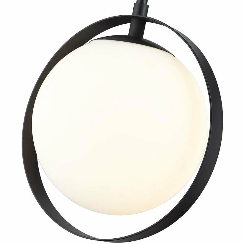 Send visual cues upward to capture a whimsical, charming look in a dining or main living space. Modern styling with strong industrial elements forms a delightful mini pendant light that lights up a compact kitchen, dinette, or reading space. A linear matte black finish steel frame sets the stage for a single matte opal glass globe bulb encased in an open steel ring to create mood-lifting ambiance that lends a hint of space-age personality to this enticing light.