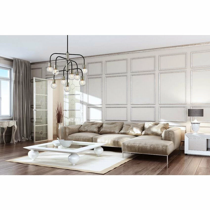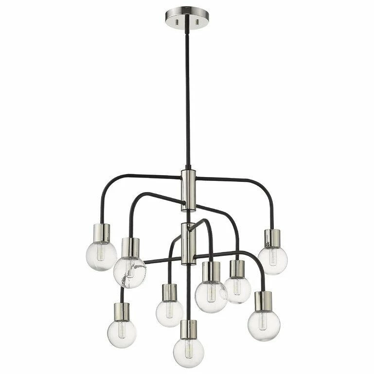With a vintage character and expansive steel frame structure, this mid-century modern-inspired nine-light chandelier comes from the Neutra collection. Nine clear glass globes illuminate the entire space, while a two-tone finish in matte black and glimmering polished nickel lend a subtle elegance. This exquisite chandelier adds a dapper Art Deco vibe inside any room, but works pleasantly within an open and airy great room or entryway foyer.