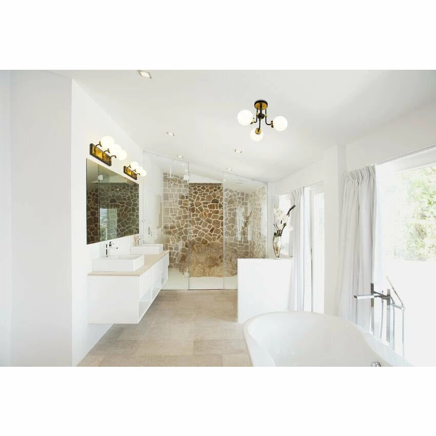 Enhance your home lighting options with the rich tones of this three-light semi-flush mount light. It’s fashioned with a matte black and olde brass finish and opal shades that deliver all the warm glow you want. It will add a touch of ambient brilliance to any space in the home,whether it be a bathroom, bedroom, hallway, kitchen or dining room.