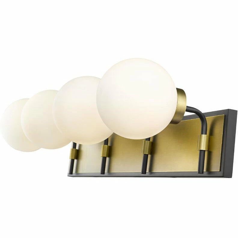 Transform the look of your home with this gorgeous four-light vanity. It’s crafted with a matte black and olde brass finish and opal shades that deliver a warm radiance. You’ll love how it’s a perfect fit for a master bathroom or powder room with its mix modern panache and old school lines.