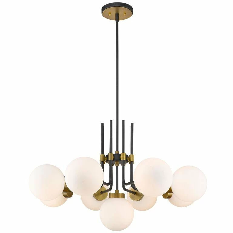 Rich tones and a majestic design highlight this nine-light chandelier for your home. It’s fashioned with a matte black and olde brass finish and opal shades for the warm glow you’re looking for. This elegant light is perfect for the dining room, foyer, hallway, or kitchen.